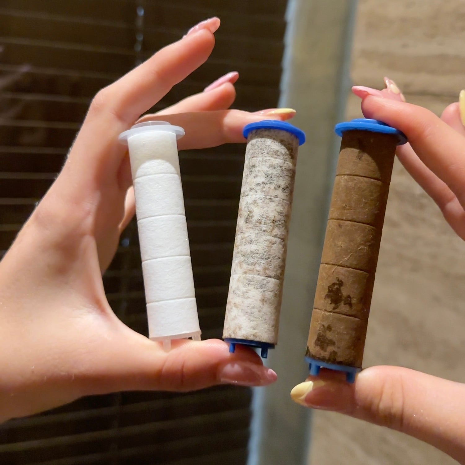 A képen egy használt (balra) és egy vadiúj (jobbra) AquaJet vízszűrő látható. A használt szűrőn jól látható a vízkő és a szennyeződések lerakódása, ami megmutatja, mennyire hatékonyan megtisztítja a vizet az AquaJet szűrő.